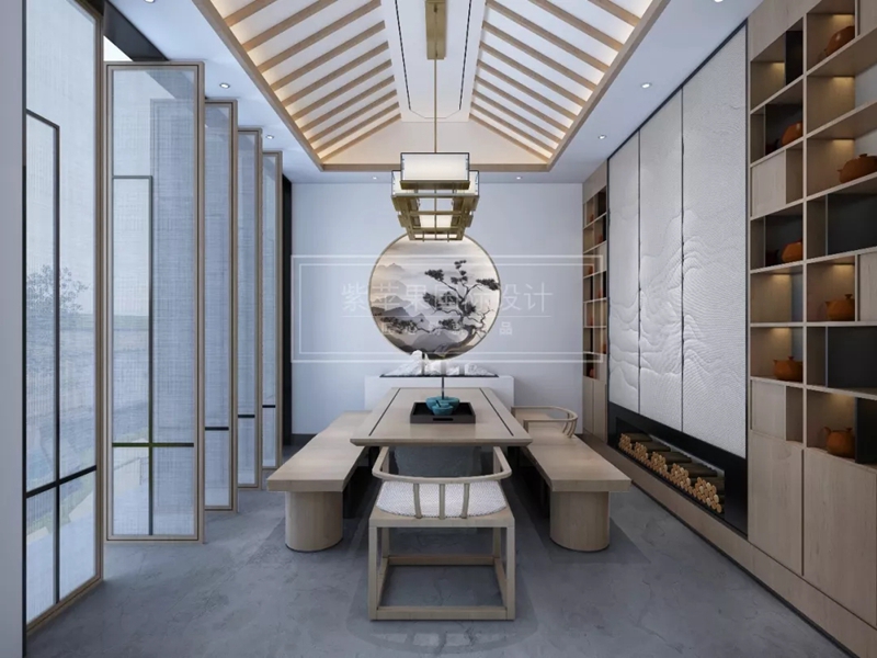 茶室的布置順延墻壁,寬敞的茶桌連接著水墨畫(huà)背景的卡座,半墻的壁的展示架等,無(wú)論是坐在卡座上品茶還是站起來(lái)望著窗外的風(fēng)景微風(fēng)輕輕拂過(guò),如此自然舒暢。