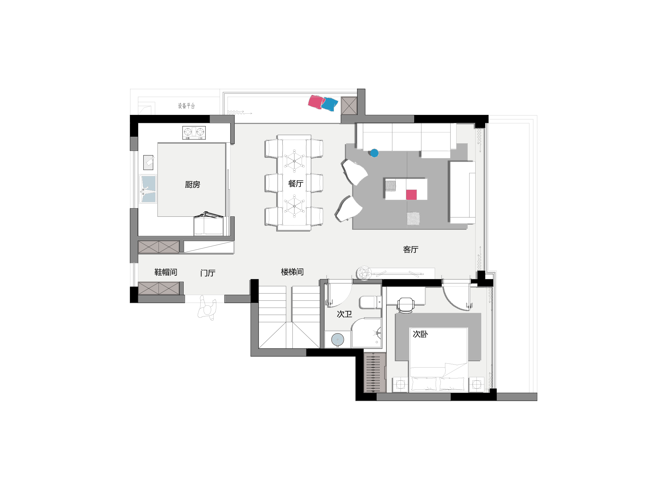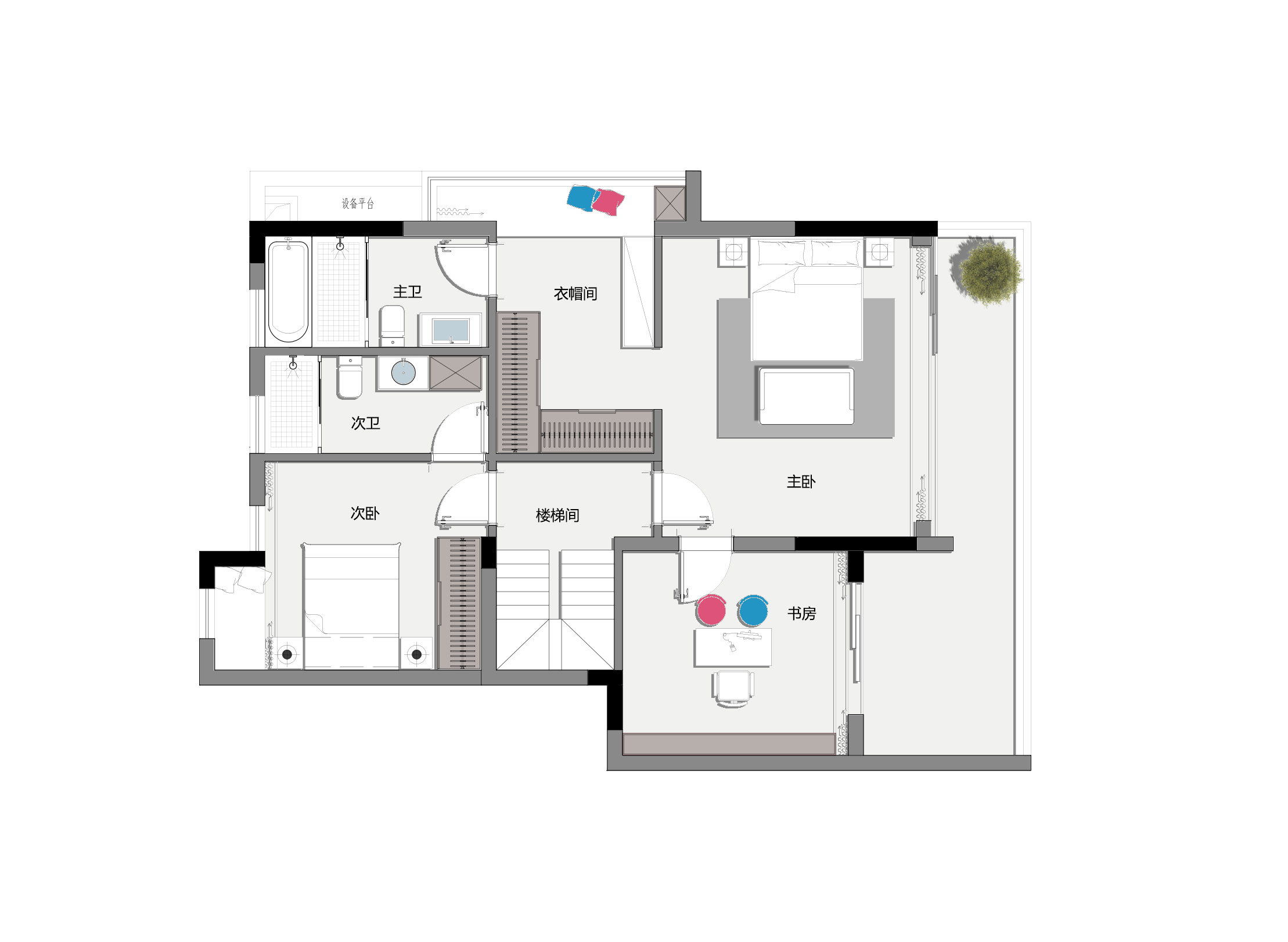 層是主要的休息區(qū),方案一做了兩個起居室,一個大套房,另一個方案則做了一個書房,一個大套房,一個次臥。