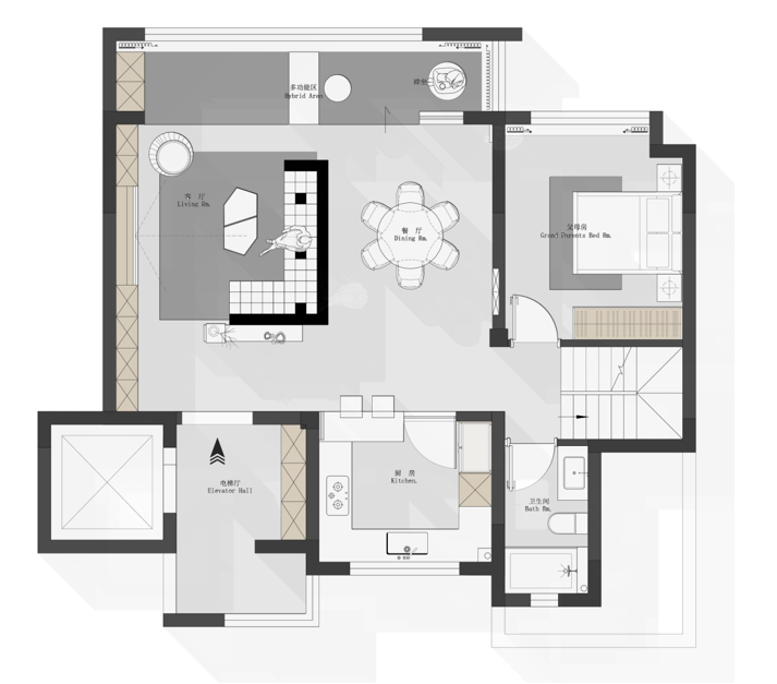 此戶型原始結(jié)構(gòu)比較方正,這個(gè)客戶的一樓沒有大動(dòng),保留了原始,陽(yáng)臺(tái)打通做了休閑晾曬區(qū)域,u型中廚設(shè)計(jì),空間足夠大,可以進(jìn)行美食烹飪,老人房也設(shè)計(jì)在了一樓