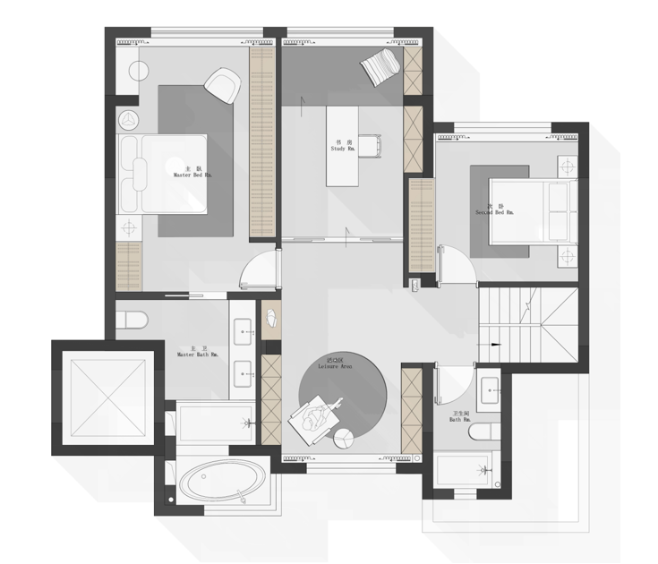 二樓我們?cè)O(shè)計(jì)了兩個(gè)臥室,東南面是一個(gè)主人的大套房,雙臺(tái)盆衛(wèi)浴都齊全,還有設(shè)計(jì)一個(gè)大浴缸,外面的區(qū)域大多做了休閑娛樂,應(yīng)主人的要求安排了書房,南面另一個(gè)次臥可以做客房或者兒童房。