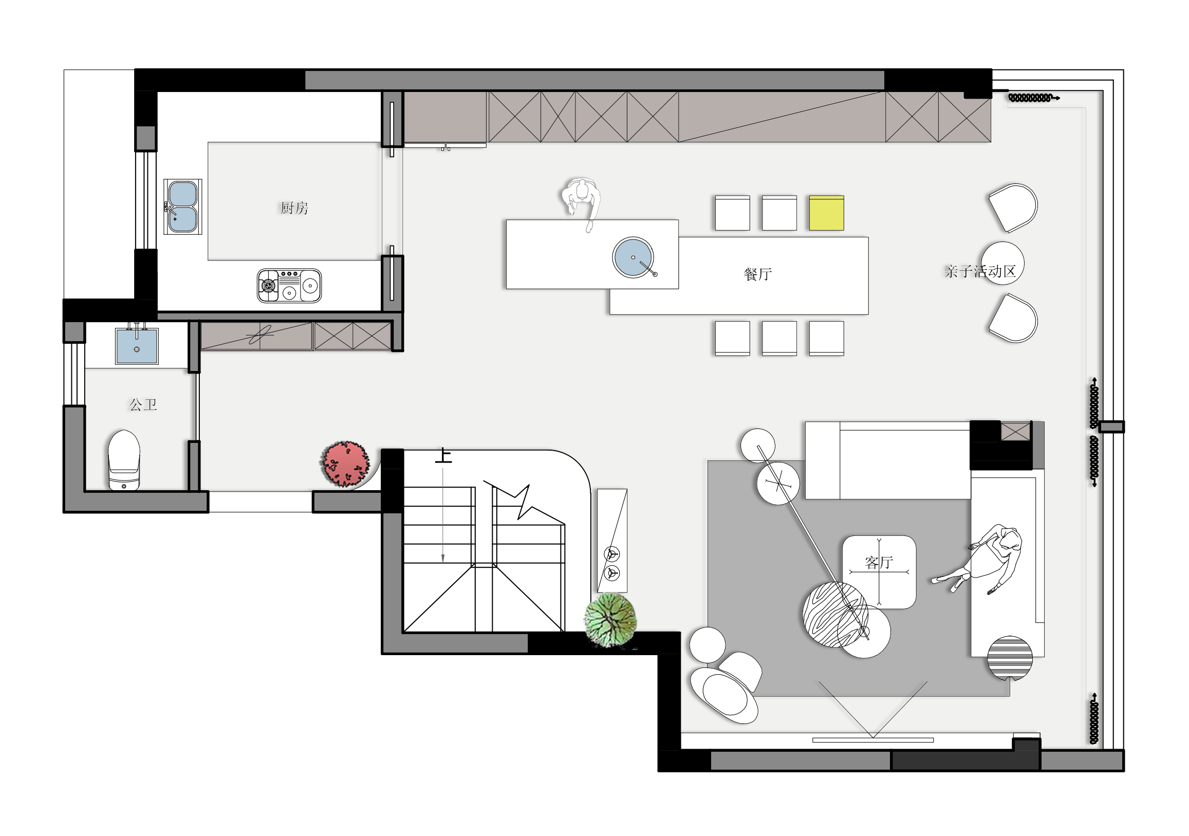 1?一層通過(guò)敲砌墻調(diào)整了空間的完整性。入戶做了