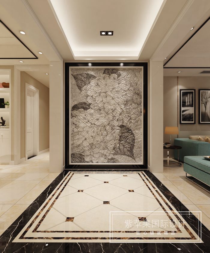 整個空間簡潔貫通,以米白色為底色,配以湖藍色的沙發(fā)及明黃色的臺燈打破單調,又在餐廳與客廳間的玄關處貼以馬賽克背景墻作為兩個功能處的銜接,豐富了空間的層次感。使空間呈現出活潑、明媚的感覺,新中式的細節(jié)和簡約風格也能碰撞出不一樣的火花。