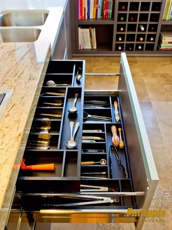 由于廚房的用品多而雜,然而小廚房的面積又小,物品的擺放有可能顯得雜亂無章,那么在設(shè)計的時候就要考慮到小廚房應(yīng)該盡量的將收納功能做到優(yōu)。