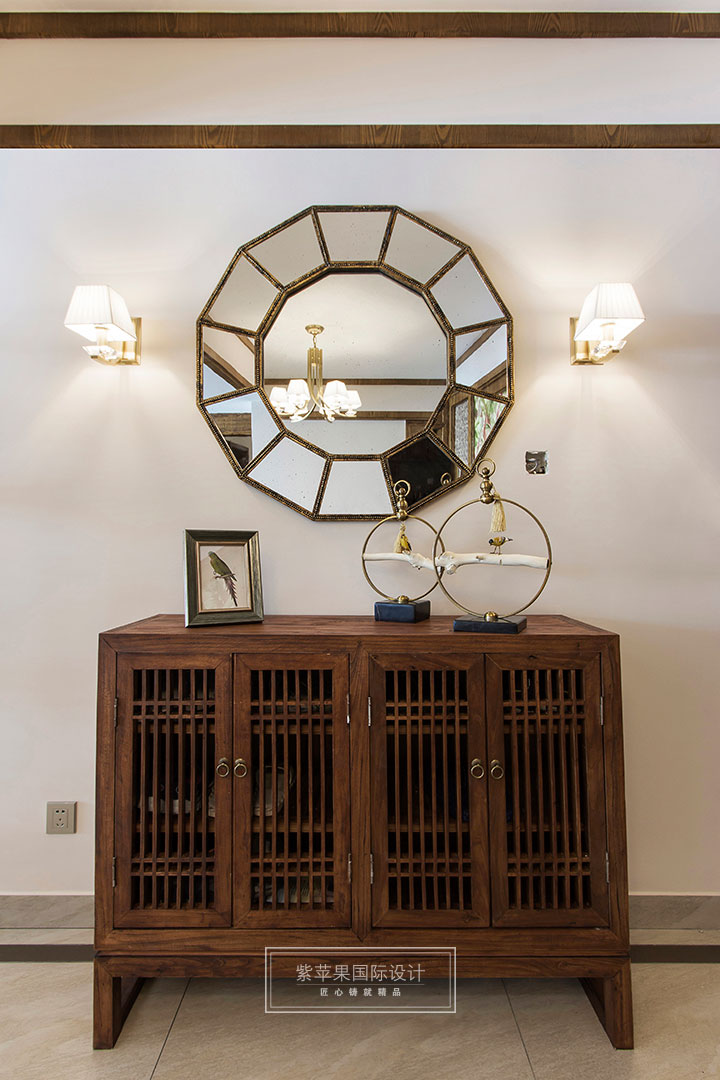 因本案業(yè)主是作為度假需求使用,所以玄關處并未做復雜設計,而是從美觀角度出發(fā)僅作簡單陳設,棕色系鞋柜和精致的裝飾品風格獨特而別致,雖是簡單陳設卻不感隨意潦草,讓到訪者一入門就深感業(yè)主對生活品質的不凡追求。