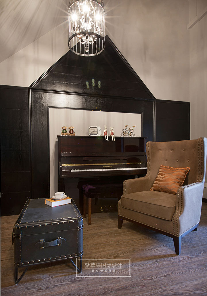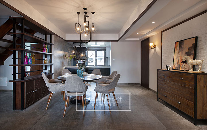 工業(yè)風居住空間如果不融入柔和的元素,太多的裸露會讓人感受不到生活的精致,所以各種布藝、皮質、木質家具的填充,精致掛畫、裝飾品的加入,精致燈飾的點綴,就使得工業(yè)風味獲得平衡。本案中的鹿角燈飾、金屬燈、創(chuàng)意掛畫、美式皮質沙發(fā)、木質家具都格外恰當,軟化了空間,增加了精致感。